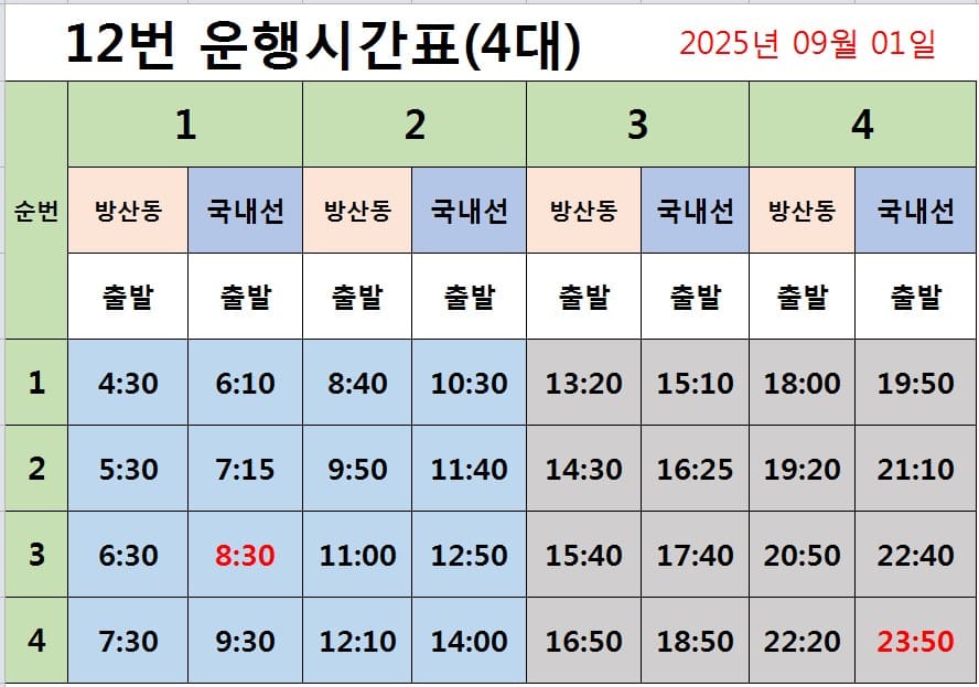 ▶ 첫차시간 / First Bus : 신천동 – 04:30 김포공항 – 05:50 / Sincheon-dong – 04:30 Gimpo Airport – 05:50 ▶ 막차시간 / Last Bus : 신천동 – 22:20 김포공항 – 23:50 / Sincheon-dong – 22:20 Gimpo Airport – 23:50