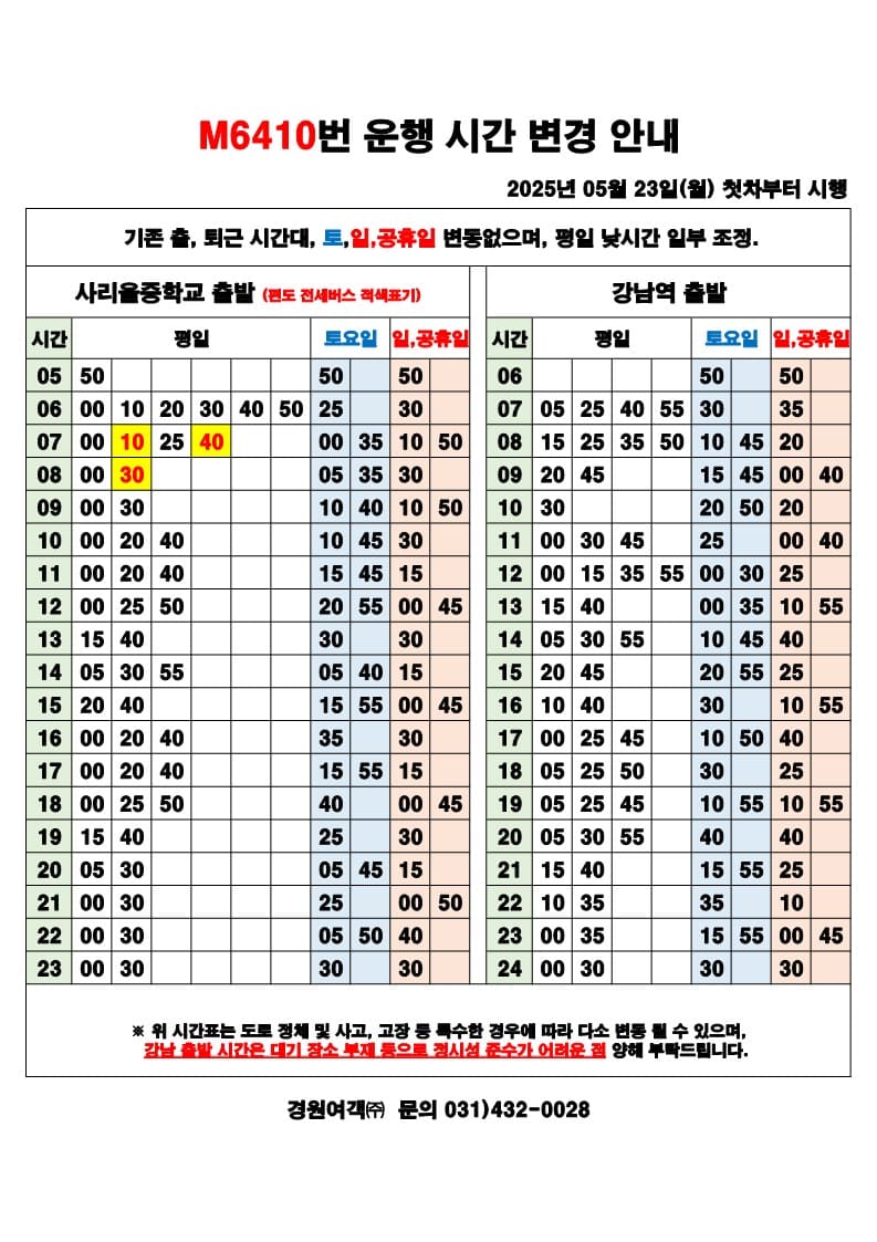 ▶ 첫차시간 / First Bus : 사리울중학교 – 05:50 강남역 – 07:00 / Sariul Middle School – 05:50 Gangnam Sta. – 07:00 ▶ 막차시간 / Last Bus : 사리울중학교 – 23:30 강남역 – 00:30 / Sariul Middle School – 23:30 Gangnam Sta. – 00:30