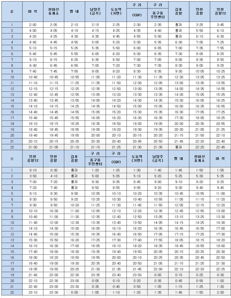– 인터넷/모바일 예매시 : 구리. 남양주 → 김포. 인천공항 / 김포공항 → 구리. 남양주 : 버스타고 (바로가기) 인천공항 → 구리. 남양주 : 시외버스 통합예매시스템 / 티머니GO (바로가기) |