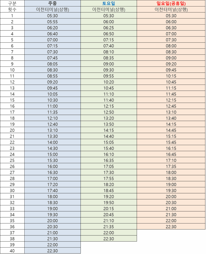 ▶ 첫차시간 / First Bus : 이천터미널 – 05:30 강남역 – 06:40 / Icheon Bus Terminal – 05:30 Gangnam Sta. – 06:40 ▶ 막차시간 / Last Bus : 이천터미널 – 22:30 강남역 – 23:40 / Icheon Bus Terminal – 22:30 Gangnam Sta. – 23:40