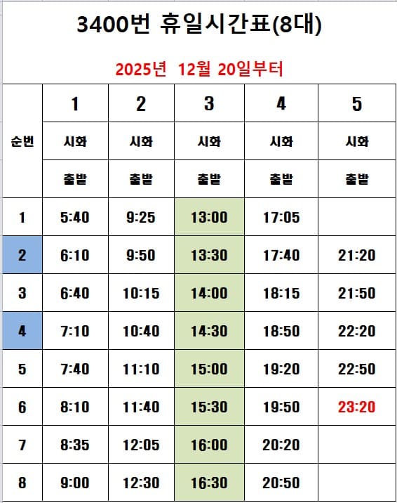 ▶ 3400번 시간표 / Time Table : ( 출처 : 시흥교통 : http://www.shbus.net )