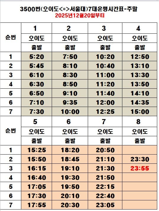 ▶ 3500번 시간표 / Time Table : ( 출처 : 시흥교통 : http://www.shbus.net )