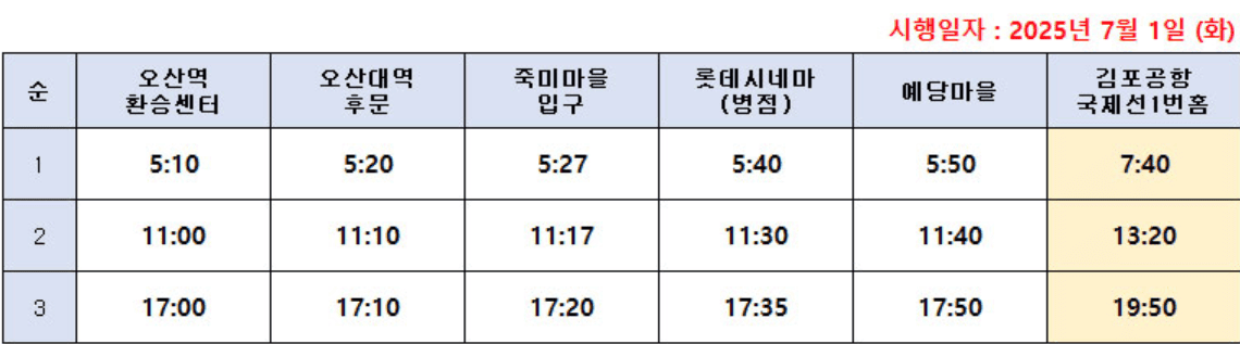 ▶ 첫차시간 / First Bus : 오산역 – 05:10 김포공항 – 07:40 / Osan Sta. – 05:10 Gimpo Airport – 07:40 ▶ 막차시간 / Last Bus : 오산역 – 17:00 김포공항 – 19:50 / Osan Sta. – 17:00 Gimpo Airport – 19:50