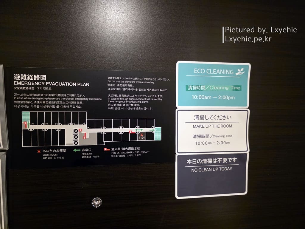 객실로 들어왔구여 재실청소는 오전 10시~오후 2시 사이에 문짝에 스티커를 부착해 달라고 합니다