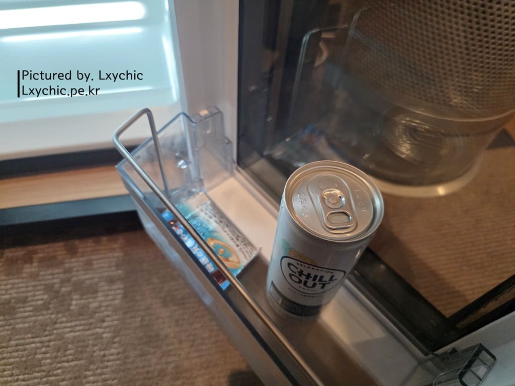 냉장고 문이 투명하게 되어있는데 안쪽에는 칠 아웃이라고 하는 탄산음료 1캔과 초콜릿이 들어가 있습니다
