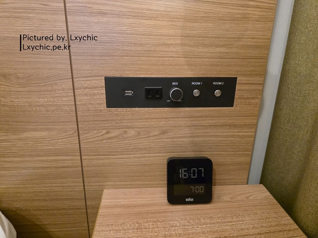 침대 옆에 작은 탁자가 하나 있구여 USB-A타입 포트 1개, 콘센트 1개, 전원 제어부가 비치되어 있습니다